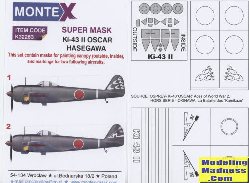 The set consists of two sheets of pre-cut stencils for the markings on two planes and one that has inner and outer canopy masks and wheel masks. The two markings options are for the 248 Sentai at Hollandia in New Guinea in March of 1944 and a plane of the 19th Shimbu-Tai in the Tokyo area in March 1945. Both planes are dark green upper with unpainted metal undersides.