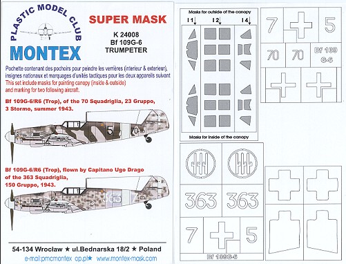 For the big Trumpeter 109G-6 comes this sheet for a pair of Reggia Aeronautica Bf-109G-6s from the summer of 1943. The decal masks include both inner and outer canopy masks as well as unit markings, insignia and other bits. Both appear to be basically in RLM 74/75/76 with any over-painting done in Italian light grey as used on the undersides of their planes. Both have white fuselage bands, spinners and lower wing tips.