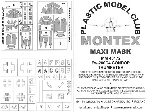 This set is for the Trumpeter 1/48 FW-200C-4 Condor. It contains both inner and outer canopy masks (actually, masks for all the clear bits), insignia with swastikas, unit badges as well as a full set of code letters for two aircraft. Neither one is shown on an accompanying sheet, which leads me to believe these are direct kit markings replacements.