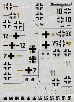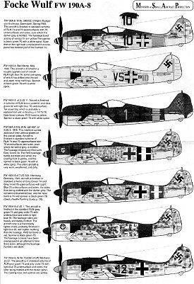 This sheet has markings for seven different FW-190A-8 aircraft and unless noted, they are in the RLM 74/75/76 scheme. There are a number of 190A-8 kits around from Academy, Italeri, Hasegawa and probably quite a few more that I've neglected. As to which is the best, well, most will go with the Hasegawa kits, though that company hasn't issued any of their usual reboxings in quite a few years.
