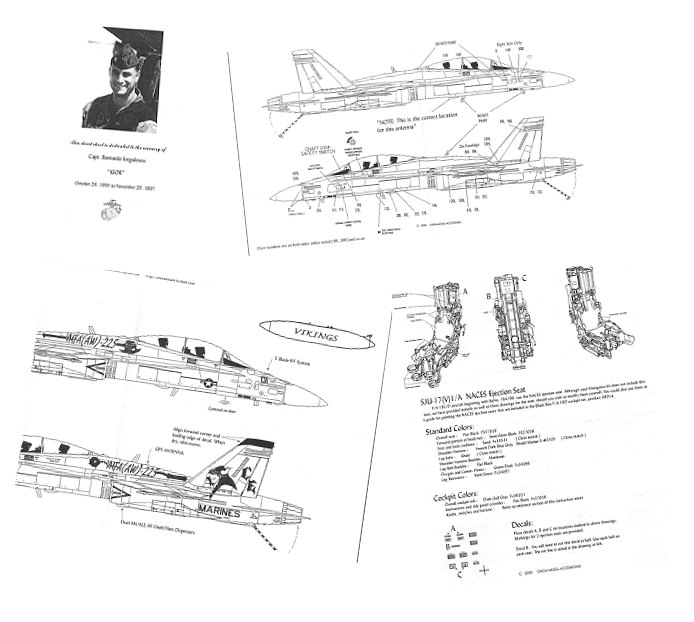 The first thing that strikes you when opening the package, is that there is a veritable tech manual supplied with each sheet. Without going into huge detail, there are four sheets. You can see scans of parts of these sheets below. One is a dedication to Capt. Bernardo Iorgulescu. Inside this is a listing of a number of F-18 decal sheets as well as other resources to help you in making an accurate F-18D.