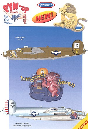 The second aircraft on the sheet is actually an F-7A photo recon bird. Based on the B-24J-1 airframe, 'Hangover Heaven' has an outrageous nose art of a drunken pink elephant. This type of artwork was typical of the 20th CMS. The aircraft has the cockpit framework in OD, which is a bit unusual. The decal sheet supplies the camera windows so there is no need for you to do any major conversion work.