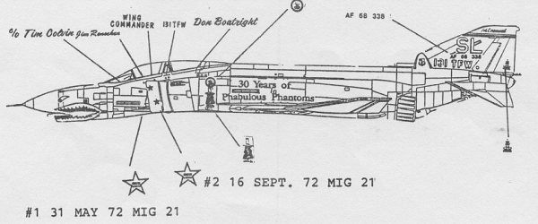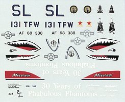 This is one of Repliscale's single aircraft sheets. This one is for the special 30th Anniversary of the F-4 that was painted up in 1988 by the 110 TFS, Missouri ANG. One of the more colorful F-4s done, this one was also a double Mig-killer from the Vietnam war. Though the decals give you lettering for both sides of the fuselage, there is quite a bit of debate as to if this was painted on more than just the left side. I have never seen a photo of this plane with these special markings on the right. Perhaps a reader will have a shot to share and clear up this mystery. The aircraft itself (sans special markings) is now on a pole at the Missouri ANG complex at Lambert Field in St. Louis in the same Hill Grey II scheme it wore at the time of being a 30th Anniv bird.