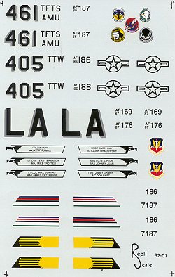 The other aircraft is the Squadron Commander for the 461st TFS. Both aircraft have the unit colors on the inside and outside of the upper fin. Only one plane can be built using this sheet as there is only one set of insignia, tail codes, and badges. To do the 461 bird you'll have to cut that unit's badge out of the one for the wing co's plane. Oddly missing is the 405 TTW badge for the right side of the intake.