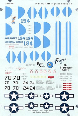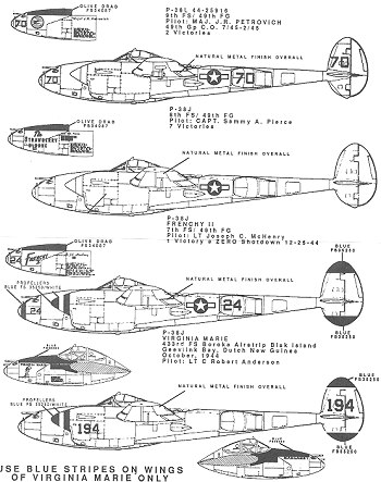 The last plane is 'Virginia Marie' of the 433rd FS. This not only has all the color of 'Frenchy II' but also has white stripes next to the blue markings and has white outlined blue bands on the upper wings. Best of all, it has a nice cheesecake nose art.