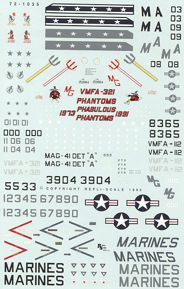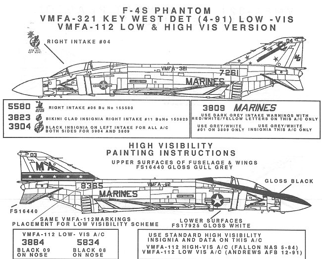 This sheet has aircraft for those last two USMC Phantom squadrons, and offers a number of options on this 1992 sheet.