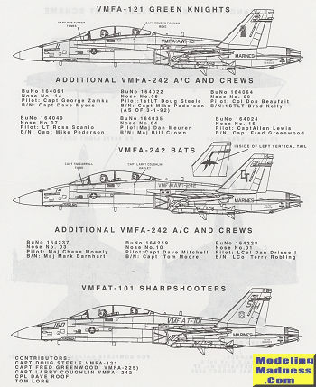 For the VMFA-242 aircraft, the instructions have a tie-in with the nose numbers, serial numbers and the crew names. The out of place serial number is 163734, which is an F-18D so quite usable if you have any information on it.