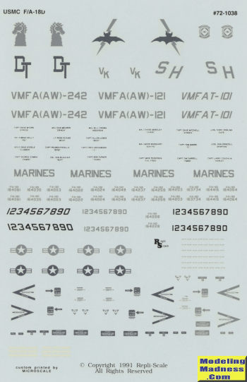 Realistically, you can only do two complete planes with what comes on the sheet as there are insignia and data markings for two. Using decals from the kit, you could do a third as there are three sets of unit markings. There are enough 'modex' numbers to cover most options if you are careful as to which aircraft you are modeling. By that I mean that if you model '00' you eliminate the VMFAT-101 option and half the VMFA-242 planes. Likewise, if you choose the VMFA-121 plane's '11', you also eliminate doing the VMFAT-101 option and the other half of the VMFA-242 planes. In both those cases you'd not have enough numbers to do both fin tips as only two full sets of those numbers are offered and you need four sets.