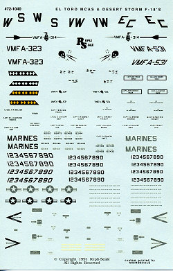 The sheet includes enough insignia and common markings to do two of the aircraft on the sheet, but one of those has to be from VMFA-323. Of course, you can supplement things with kit decals. This sheet offers the nose and fin numbers in both black and dark grey, but makes the error of only providing one of each number. This means you have to be quite careful of which options you choose and there are not enough '1's to do aircraft 11 of VMFA-314 or enough '0's if you wish to do two lighter grey marked aircraft.