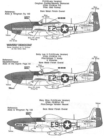 Finally, on the bottom of the instruction sheet are two 376 FS late P-51Ds. 'Daisey Mae' and 'Mary Mine' have the required yellow nose and also yellow rudders that were identifying colors of this squadron.
