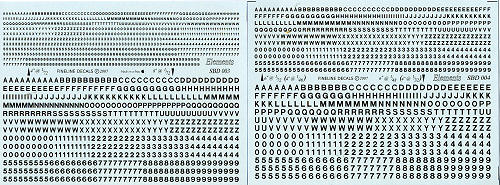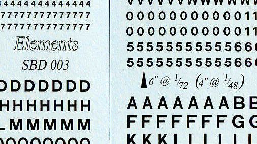 Sheet 003 (on the left) is 4" and 8" 1/72 size while 004 is 6" 1/72 (4" 1/48) and 6" 1/48 (4" 1/32). I've shown an enlarged closeup of sections of both sheets. Both of these sheets are printed in black ink. The decals are covered by a solid carrier film so each letter or number will need to be cut out. These are a great replacement for the quite old Modeldecal sheet that many of us have used in the past. The sheets can be purchased direct from the link below.