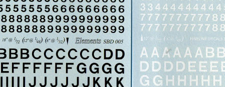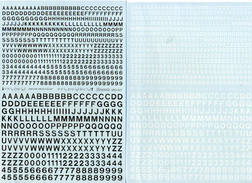 Sheet 005 (on the left) is 12" and 18" 1/72 size, 8" and 12" in 1/48, and the larger size is 8" in 1/32. This sheet is in black while an identical sheet, 008, is printed in white with the same sizes. I've shown an enlarged closeup of sections of both sheets. Both of these sheets are covered by a solid carrier film so each letter or number will need to be cut out. I have also darkened the images so that the white is a bit more visible. These are a great replacement for the quite old Modeldecal sheet that many of us have used in the past. The sheets can be purchased direct from the link below.
