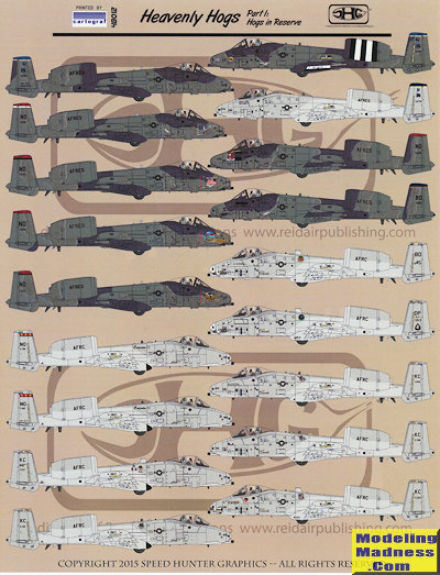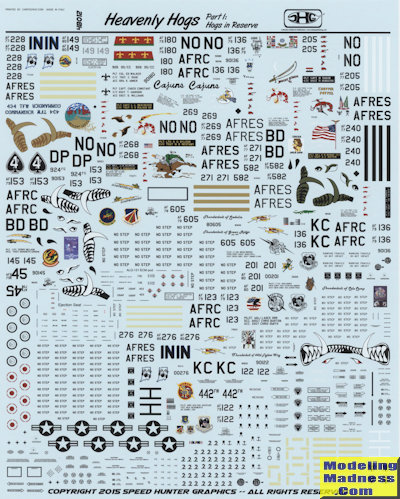 This particular sheet covers Reserve units that have flown the plane since about 1983. Most of these units were flying the OA-37 prior to this so had ground attack experience. The sheet covers 16 different aircraft in both the Euro I and Greys camouflage schemes. These units are from Grissom, Barksdale, New Orleans and Whiteman. Many are Desert Storm or Bush war veterans with several carrying nicely done shark mouths, nose and/or door art, as well as mission markings with one carrying D-Day stripes.