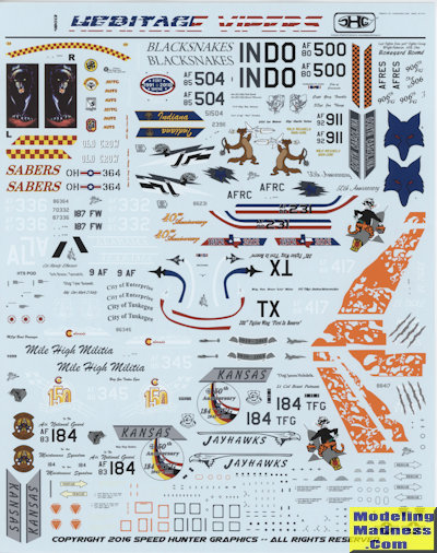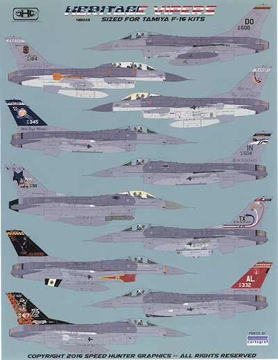 This particular sheet covers eleven different ANG/AFRES F-16s. Most of these are F-16Cs with one lone A model in the mix. The decals are designed for the Tamiya 1/48 F-16 which is fine for most of the subjects as the two Tamiya variants are a Block 25/30 and a Block 50. However, their F-16A kit is a prototype and so not one that can be used. Note that the F-16A is shown in the art work with the smaller horizontal stabilizer. As for the Block 42 plane, I'm not sure if that can be built from the Block 50 kit or not.