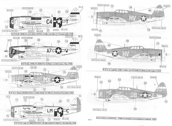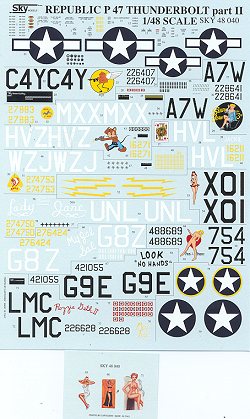 As it the norm with Sky sheets, the printing and colors are absolutely first rate with no glitches of any kind on the sheet. Variety is definitely the spice when it comes to this super decal sheet with planes from early to near the end of the P-47s involvement in the war. It includes some rather tasty nose art as well. As a bit of a bonus, three bomber nose art images are included with this very colorful sheet.
