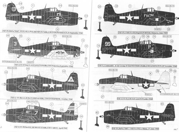 Some of the planes are from carriers when the geometric markings were in vogue. These white markings will have to be painted on the model by the builder. In these cases, you will need an outside reference for what needs to be done on the wings. Sky has, for some reason, decided not to print that information in the instruction book. In fact, that is probably one of the biggest problems with Sky decals. Since they offer so much, they do not provide the space in their booklet for wing or tailplane markings. Some of the planes on this and other sheets do have unique markings there, yet the builder would never know it from the instructions. That is one reason why it is so important to double-check with the references provided before starting on your kit.