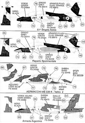 Sky Models has been insightful enough to produce a sheet for the MB.339 in 1/72 scale. It is quite complete as are all Sky Models sheets that I have seen. There are sufficient common markings to do 5 aircraft using the sheet. Taking these common markings from the kit sheet will vastly increase the number of aircraft you can do.