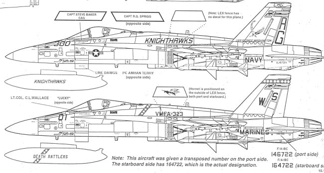 First is the CAG bird from VFA-136, the Nighthawks. Though not the ultracolorful aircraft of the past, this one does have all of its markings in a nice blue with any letters/numbers outlined in white.