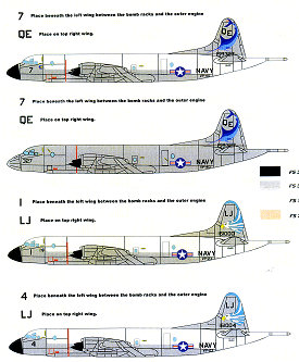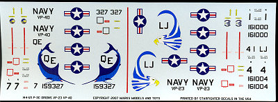 Starfighter Decals has produced this sheet for two of the more colorful VP squadrons; VP-23 and VP-40. The sheet offers two different aircraft from each unit. Most are in the old white over light gull grey, though there is one in the newer overall grey with the 'last three' of the serial as the nose number. The sheet lists this as overall light gull grey, making it easy to paint.