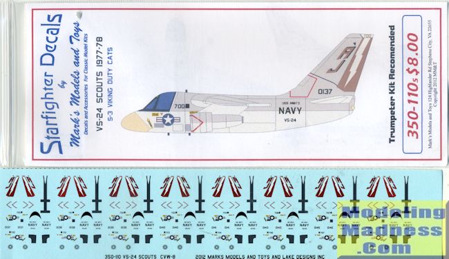 Starfighter Decals has released a new sheet for those modeling somewhat modern carriers in 1/350 scale. In particular, this sheet covers the S-3A Vikings that were delivered to VS-24 Scouts during their initial outfitting with the type.