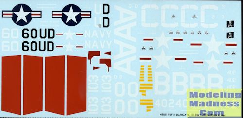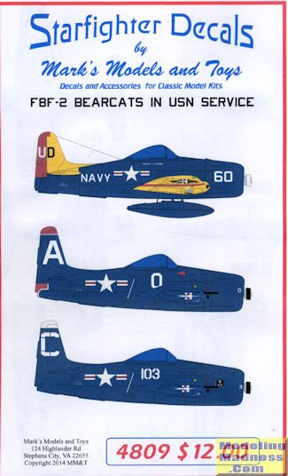 We have a nice Bearcat sheet, courtesy of Starfighter Decals. This sheet provides markings for four aircraft, though only three are shown on the cover. All are in the base scheme of gloss sea blue, though there are exceptions. For kits you can choose from a variety from Testors/Hawk, Hobby Boss, and Academy/Hobbycraft. All the schemes are -2 Bearcats.