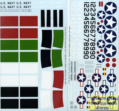 There are two decal sheet in this set. One consists mostly of fuselage and wing bands. This sheet also has wing walk areas, which include the aluminum surround that you rarely see in wing walk markings. The other has a full selection of numbers in various sizes and colors as well as insignias from different eras and prop tip markings.