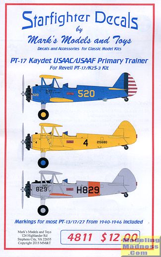 This sheet provides markings for USAAC/F aircraft. Starfighter has produced a neat concept sheet that includes all of the possible markings that were carried by the variety of Kaydets operated by the service from 1940 until 1946. Unlike the Navy, the Army went through a number of color schemes including blue fuselage with yellow wings, overall yellow, overall aluminum lacquer and combinations of those. For instance, at one time there were aluminum planes with yellow upper upper and lower lower wings. Apparently the yellow dope deteriorated rather quickly so the move to aluminum dope. I also found it interesting that the US ARMY under the wings stayed there until December of 1943.