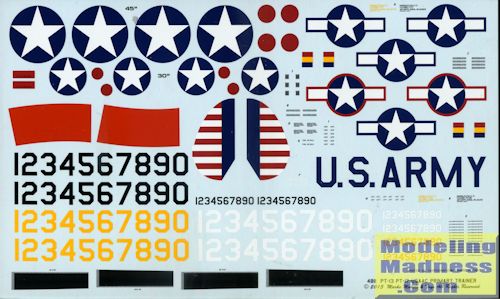 As in the Navy sheet, there are insignia that cover the time period, and this includes the rudder stripes used until mid 1942. There are numbers in black, yellow and white along with the orange fuselage band used later in the war. Wing walk areas with aluminum surround are provided as are prop blade markings. The instruction sheet is in full color and provides several suggested schemes, though you can pretty well build any Army Stearman for which you have a photograph.