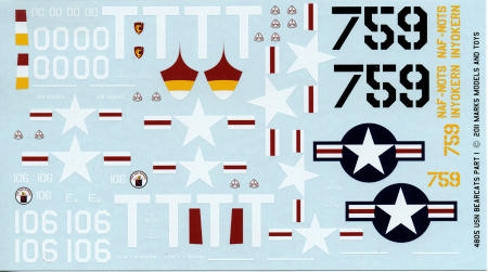 There are enough insignia to do two full aircraft and using insignia from other sheets, you can easily do all three. These are very nicely printed . The instructions give additional info like fin tip colors and prop boss colors as well as proper markings placement.