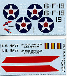 The set also includes markings for two planes. One is a hack for VF-6 from 1937 with a True Blue tail section. The other is the red tailed Yorktown Air Group Commander's plane from the 1940 time period.