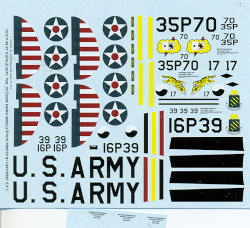 All of these planes are in the unpainted metal scheme and have colored cowling sections and the red/white/blue rudder markings of the time. There are sufficient insignia, data and stripe decals, as well as wing walk markings to do two complete aircraft. The US Army under wing markings are in black, which is, I believe, correct for uncamouflaged aircraft.