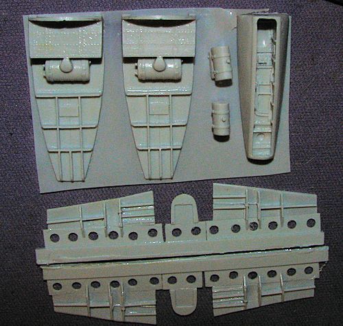 Starfighter Decals has produced a most welcome upgrade set for the still very nice Monogram 1/72 F7F Tigercat. This is a complete resin wheelwell set. It consists of three wafers/sprues that provided the nose and main wheel wells. The nose gear well is a single casting that simply needs the nose gear installed. The main gear wells are a bit more complex. Each consists of a floor, two sidewalls and a rear section. There are also a pair of Glycol tanks that are to be installed prior to the placement of the main gear struts.