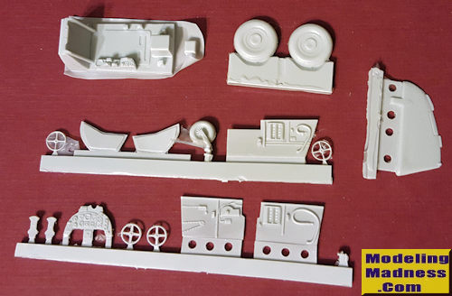 This set is designed to convert the still quite nice Revell/Monogram Bf-109G-10 that many of us have built (some of us several times) into a K-4 version. This set contains a new cockpit tub, new sidewalls, instrument panel, gun sight, rudder pedals, trim wheels, outer gear doors, tail wheel, main wheels and rudder.