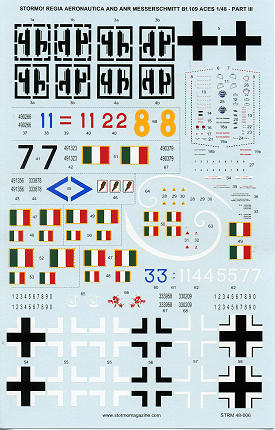 This 1/48 sheet is superbly printed. There are enough insignia to build several aircraft using just sheet markings if you pick and choose wisely. Data markings for one aircraft and nose spirals are included with this sheet.