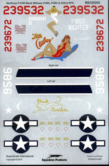 The third option is a P-61B-15 based on Morotai in 1945. This 418NFS aircraft is named 'Black Panther and carries an insignia blue tail band with a moon and star on it. Unusually, the serial number is in white.