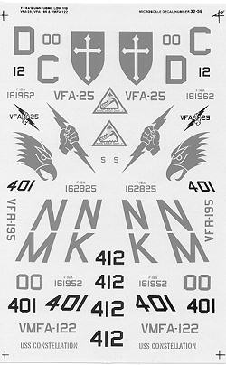 This particular sheet is so old that it is still in the Microscale jacket. It covers three F-18A Hornets in the FS 36375 upper and 36495 lower camouflage scheme. Now I'm thinking that those colors may be in error but I'm not positive so will let it go at that. There is no suggested kit, but it seems to me that back then your options would be from Revell or Hasegawa for the A model.