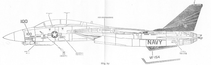 Getting back with VF-154, when the Midway got rid of her F-4 squadrons, she needed to have something to replace them. However, she wasn't fitted for the Tomcat so got extra USMC Hornet squadrons for her final cruises. When the Midway was retired and a more modern carrier took her place, then F-14s could be based with CAG-5. This was VF-21 and VF-154, who got picked. During the Gulf War, both units served with distinction, and though they didn't knock down any Migs (thanks to the hogging of all the action by the USAF), they did provide escort to USN strike groups. VF-21 is now gone, thanks to a downsizing of the Tomcat fleet, mostly because of attrition and replacement by the F-18.