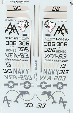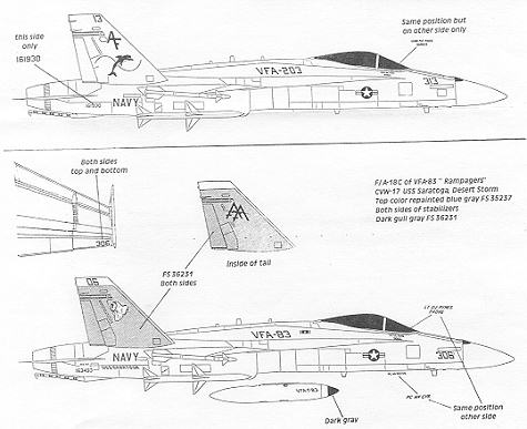 Second is an early F-18C from VFA-83. The scheme on this aircraft is FS 35237 over 36375. Both sides of the fins are in FS 36231 with the tips and leading edge markings provided as decals.