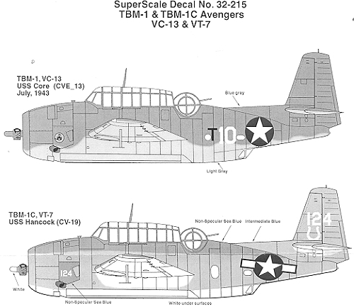 The TBF-1 is from VC-13 aboard the USS Core in July 1943. It is in the Blue-Grey over Light Grey scheme typical of early war aircraft. Also typical is the minimal markings.