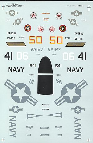 There are enough national insignia to do all three versions as depicted in the placement guide, but you will have to find another set for the F-5E. Kits of the F-5E and TA-4J in 1/32 are available from Hasegawa, or you can find an earlier Minicraft boxing of the kit, the plastic is the same. To do an F-5F you will have to do some kit bashing with two F-5Es to get the lengthened fuselage, as I know of no conversion set available for this kit in this scale.