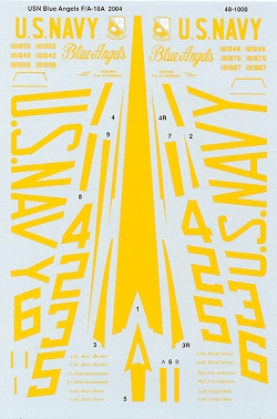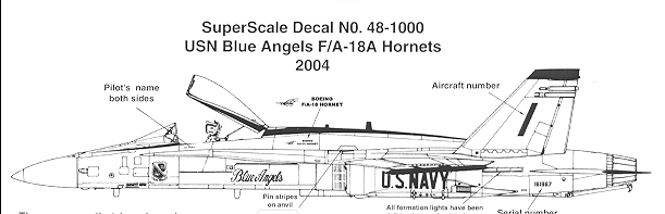 For their 1000th 1/48 sheet, Superscale has chosen the F-18A Hornet as flown by the Blue Angels during their 2004 show season. As has been the norm for the display teams, these are not the latest and greatest Hornets. In fact, they are some of the oldest still in the inventory, all from the 1619xx serial range.