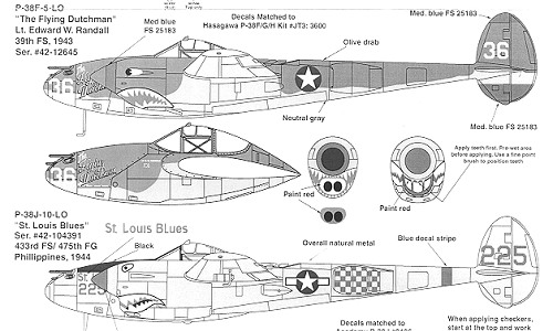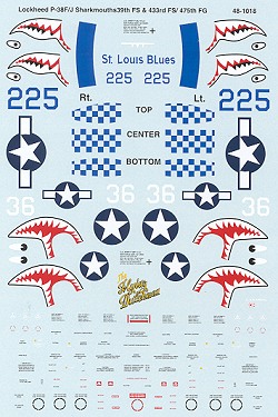 Though I believe these may both be 'repeats' from earlier sheets, it is still nice to have some P-38 decals. Both are from the 475th FG and the decals are matched to different kits. The P-38F is matched to the Hasegawa kit while the J is matched to the Academy version. Most unusual. I do believe that just about any appropriate P-38 in 1/48 could be used, even the ancient Monogram version.