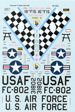 The sheet includes a full stencil suite and a super markings placement guide will help in putting these on. The only kit out there is the Revell/Monogram version and this kit requires the most recent boxing with the Case X wings. There were two different wings for the 102; the 'Case X' (10) and 'Case XX' (20) wings. Basically, the Case XX wing had a very noticeable curved down wing leading edge and wing tip. This later wing was installed on all F-102s starting with serial number 56-1317 (often shown on the tail as 61317). It was NOT retrofitted to earlier aircraft. If you want the Case XX wing, you need the original issue Monogram kit as the ProModeler kit and the most recent issue have the Case X wing.