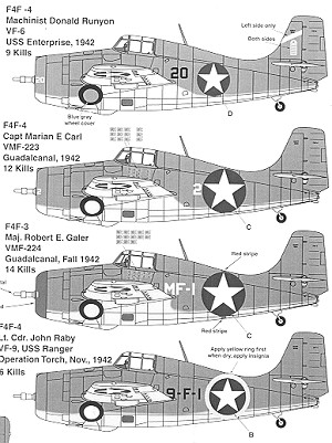 This sheet is a bit of old and new mixed into one sheet. I know that the Galer aircraft was on an older sheet and suspect that the Raby one was as well. One interesting thing to note is that the upper left Wildcat is noted as being flown by an enlisted pilot, and one with aerial victories as well. The US forces tended to treat enlisted pilots very much as second-class citizens and kept most of them out of combat. Not so the other fighting powers who realized that rank has little to do with your abilities. It is gratifying to see that there is finally a set of markings for an NCO pilot.