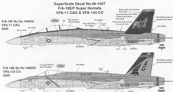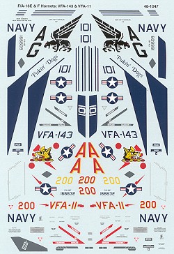 For the F-18E, we have markings for the 'Pukin' Dogs' of VFA-143, This is the squadron CO's plane and only has the full color insignia to add any 'non-grey' aspects to it.