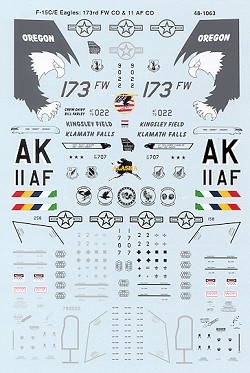 The F-15E is from the 11th AF in Alaska and has the badges of all the units on the intake sides as well as a nice colorful fin stripe.