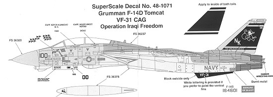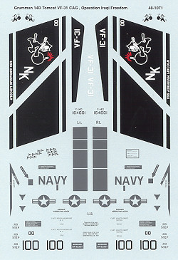 This particular aircraft is the CAG bird from the invasion of Iraq and though painted in the standard three color tactical paint scheme for the Tomcat, had faded to nearly a single shade. It has a number of mission markings on it and probably carried bomb racks as well, though I'm not totally positive in that regard. The sheet will fit both the Revell and Hasegawa kits and provides all the markings needed to do a fine job on this one. I should also point out that if one wants to paint the ventral strakes, separate decals are provided in this instance.