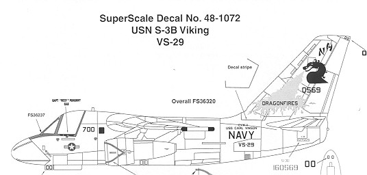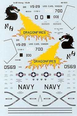This particular sheet is from VS-29's CAG bird and may well be from a final cruise. I've not kept track of unit movements since retiring in 1993 so I'm not sure what the status of the unit is. The aircraft is in the overall FS 36320 scheme that is being used on S-3s and the sheet provides a complete set of stencils and other data markings. There is only one kit ever done of the S-3 in this scale and while it was originally an ESCI kit, it has been re-released in both AMT and Italeri boxes over the years. The kit is also an S-3A and though the external differences are small, these need to be taken care of if you want to do a proper S-3B.