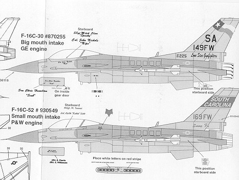 The Texas bird is an F-16C-30 from the 87 build year and has the large intake and GE engine. The South Carolina Falcon is an F-16C-52 from the 93 build year and has the small intake and Pratt & Whitney engine. Both are in the simplified scheme of FS 36118 upper and 36270 undersides with the radome in a possible variety of shades.