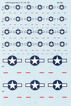 The sheet provides insignia in three sizes; 14 inch, 15 inch and 30 inch. These are quite useful for more modern USN aircraft in the full color schemes.